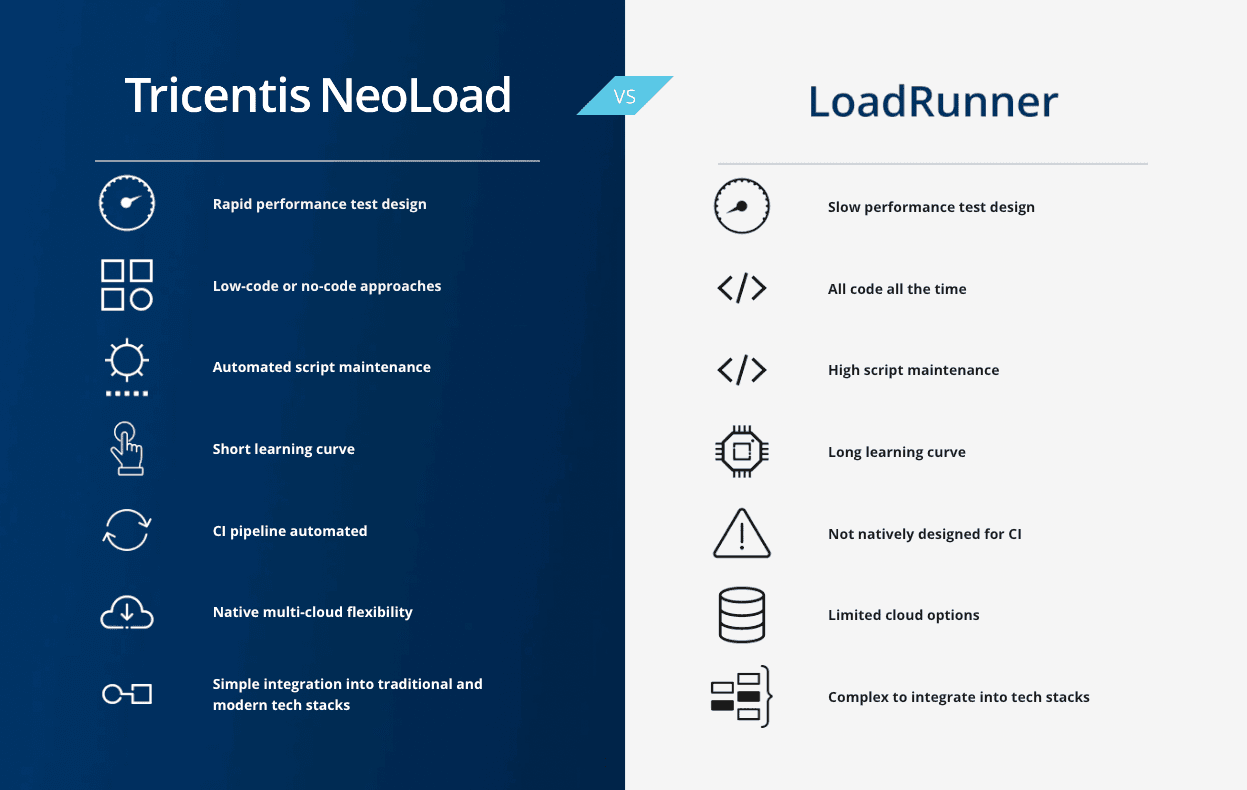Tricentisは過去10年余りの間に、世界でも特に複雑なアプリケーション環境において、LoadRunnerからNeoLoadへの移行を実現してきました。エンタープライズのお客様は一様に、NeoLoadへの移行は、思いのほか迅速かつ容易に実現でき、ビジネス価値も高かったと実感しています。主なポイントは以下の通りです。