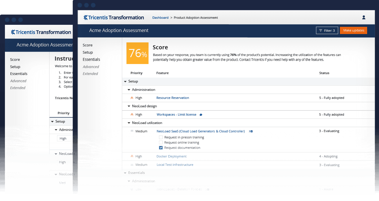 The Product Adoption Assessment (PAA) was designed to help you discover vital features for your testing practice and to realize the full potential of Tricentis products.
